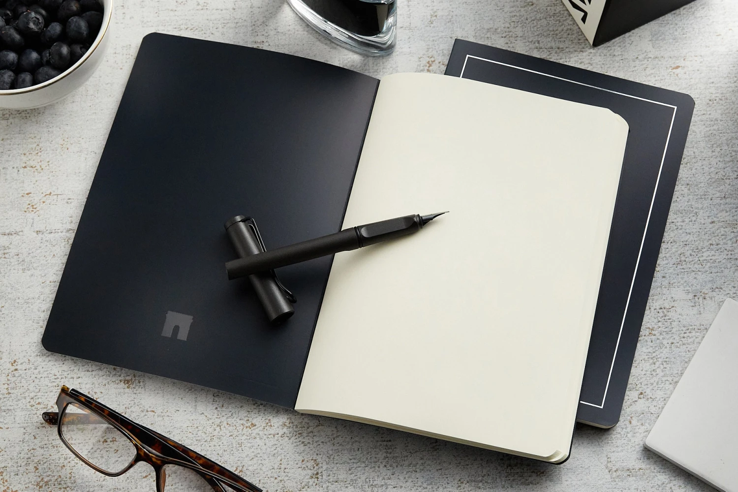 This A5-sized notebook features 48 sheets (96 pages) of blank ivory 90g Clairefontaine Triomphe paper. Both fountain pen and marker friendly, the paper is super smooth, acid-free, and pH neutral. The notebook has a sewn spine binding, yet also lays flat! The dark blue cover features silver stamping.