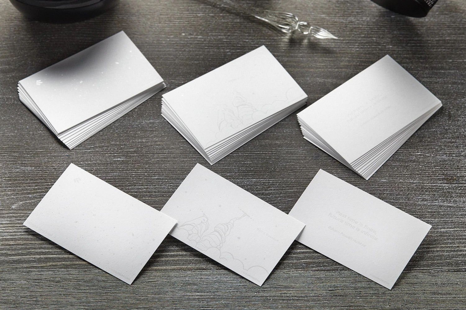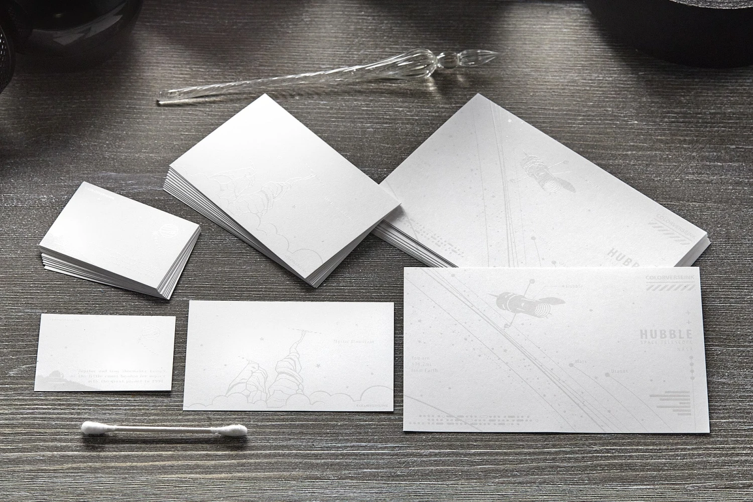 Printed on Nebula Premium paper, this set contains 15 cards each of 3 different space-themed designs for a total of 45 cards. The paper, weighing in at 200g, is able to hold fountain pen ink without bleedthrough. The white illustrations are printed using a water-resistant finish, so they’ll be visible once the ink has been applied on top.
