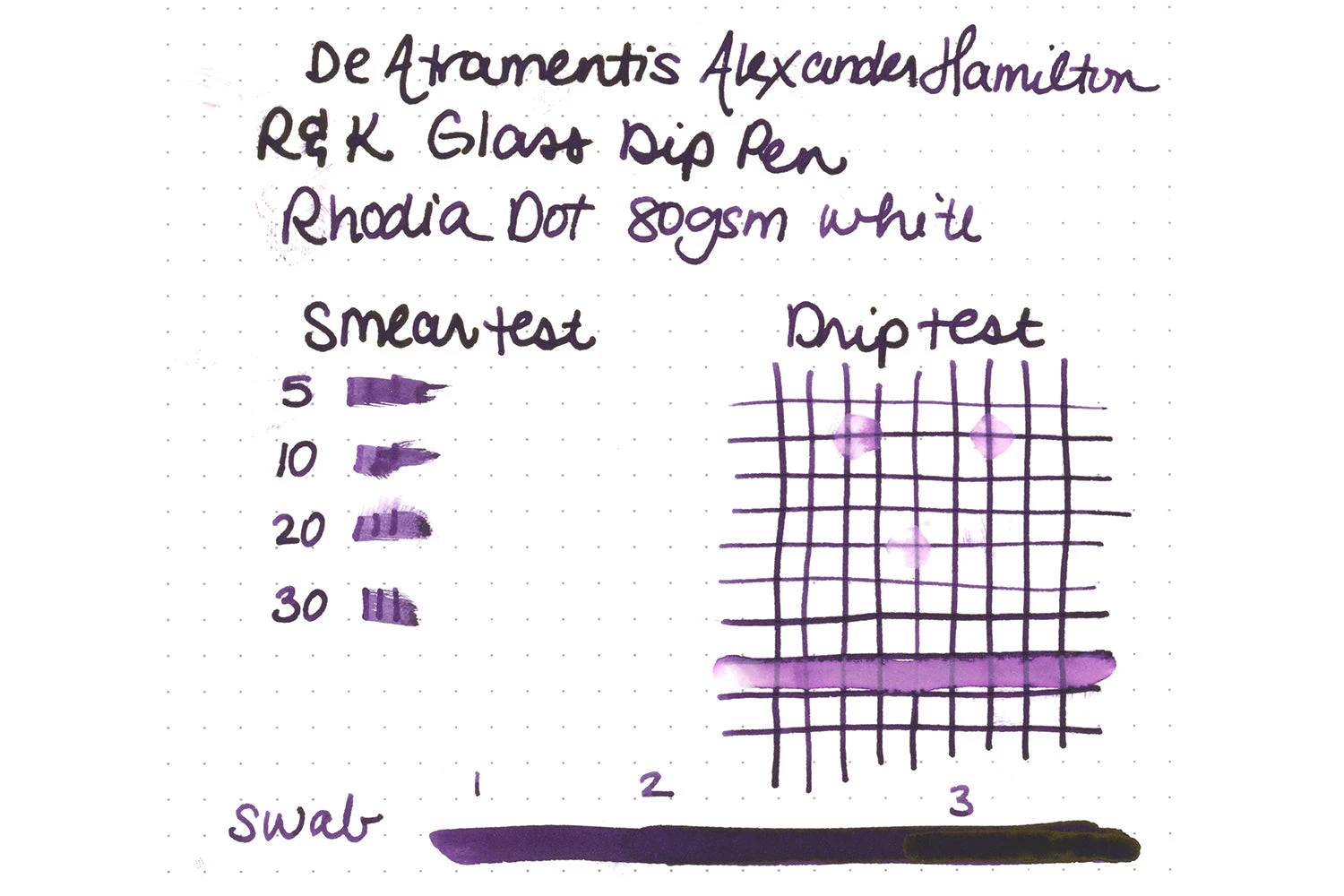 De Atramentis fountain pen inks are exclusively handmade in Germany by Dr. Franz-Josef Jansen, and come in a 45ml glass bottle. This is an aubergine purple color, and has a picture of Alexander Hamilton on the label.