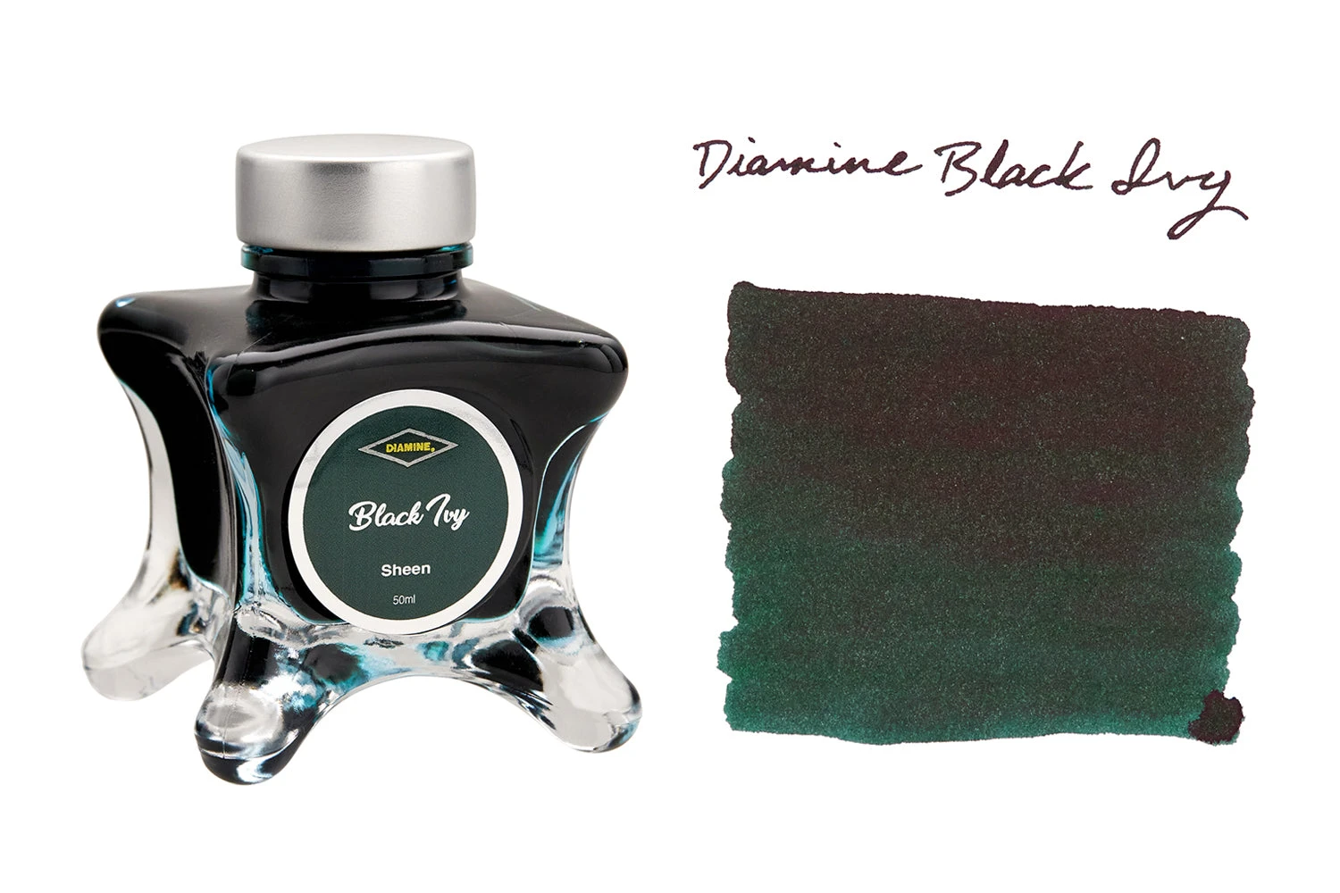 This 50ml glass bottle of Diamine Black Ivy sheening green fountain pen ink was Initially launched as part of the 2021 Diamine InkVent calendar, and is now a part of the regular Diamine Red Edition collection.