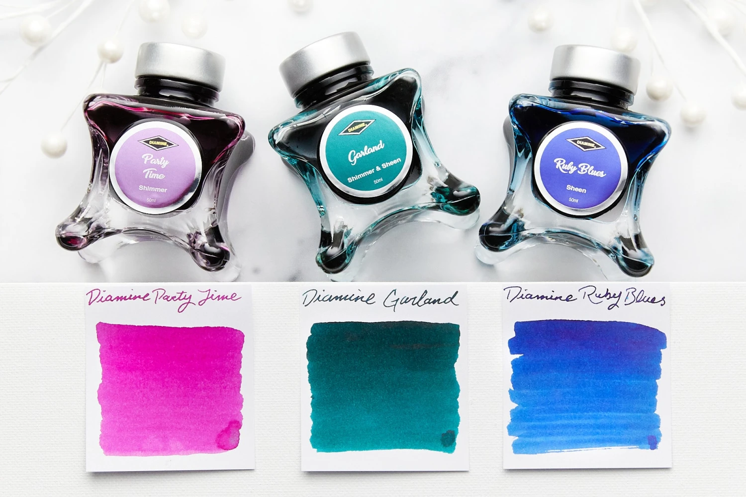 This 50ml glass bottle of Diamine Party Time fountain pen ink was initially launched as part of the 2021 Diamine InkVent calendar, and is now a part of the regular Diamine Red Edition collection. This fuchsia pink ink features added shimmer.