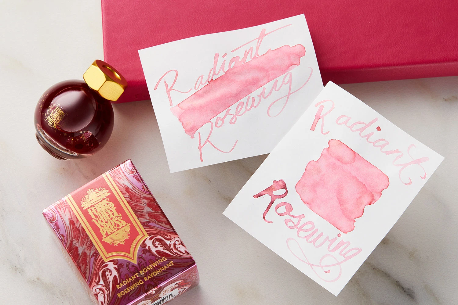 20ml glass bottle of Ferris Wheel Press Radiant Rosewing fountain pen ink, a rose pink ink with duochrome gold/pink shimmer. Radiant Rosewing is part of the FerriTales 2024 collection.