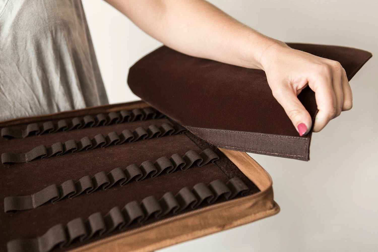 This tan leather Girologio zippered pen case has a soft velvet interior and holds up to 48 pens. Made from high quality, ecologically tanned leather, Girologio pen cases are an excellent choice for protecting your writing instruments. These leather cases are soft and supple while simultaneously being tough and durable.