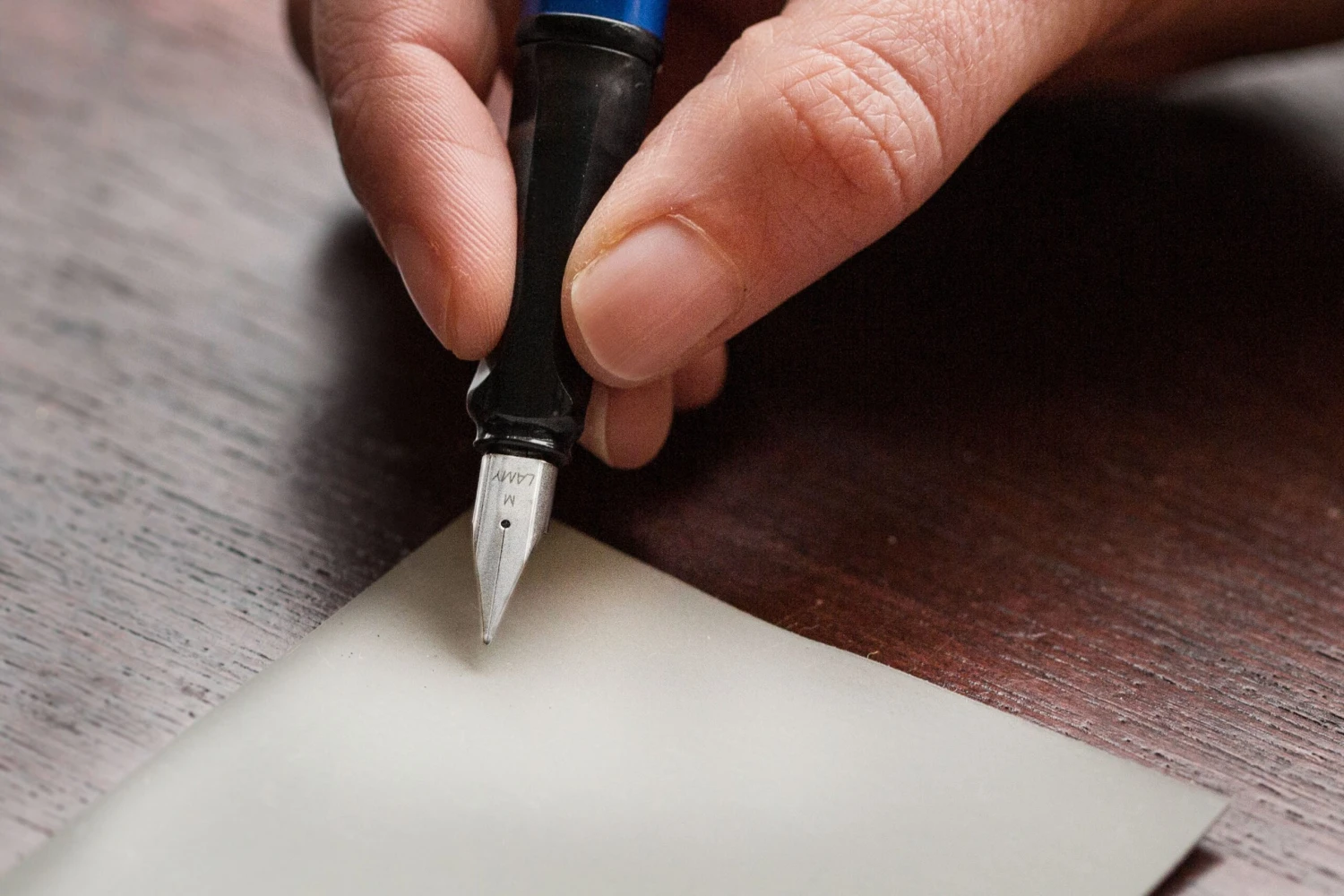 Hold your inked-up pen as you normally would, and lightly make figure-8 patterns about 10-15mm tall on a paper of your choice. This will help you to identify what part of your stroke is feeling the deepest scratchy feeling. Have your sheet of Micro-Mesh next to your paper, on a flat and stable surface. Make the same figure-8 pattern on your Micro-Mesh as you did on your paper, applying very light pressure and going fairly slow. If you are able to feel where the scratchy feeling is most prevalent, apply a slightly greater amount of pressure to that part of the stroke of your figure-8 as you’re drawing it on your Micro-Mesh. If you need to concentrate the smoothing on one particular part of your stroke, you can stop doing the figure-8 and just go back and forth in the motion that feels the scratchiest. For example, if you know your scratch is felt the worst when you write from right-to-left straight across, you can repeat just this motion on the Micro-Mesh to smooth out just that part. Repeatedly move back and forth between your Micro-Mesh and your paper, to check on your progress and only continue smoothing on the abrasive as long as is necessary to make the scratchy feeling go away. It’s best to only do a couple of figure-8’s at a time on the abrasive before checking back on your paper.
