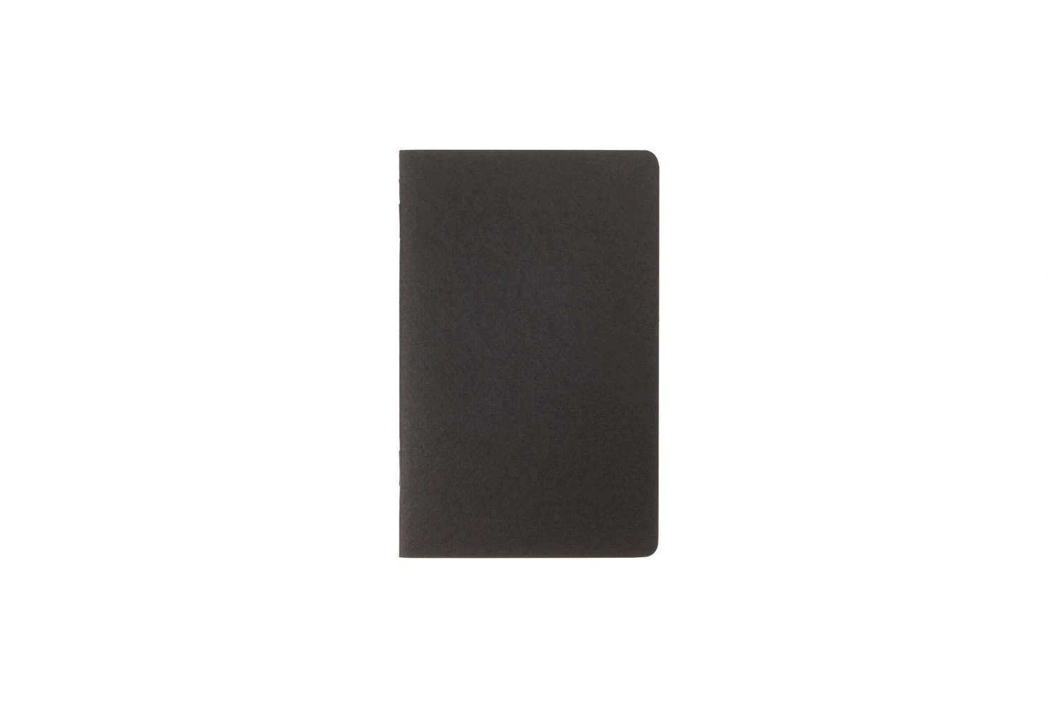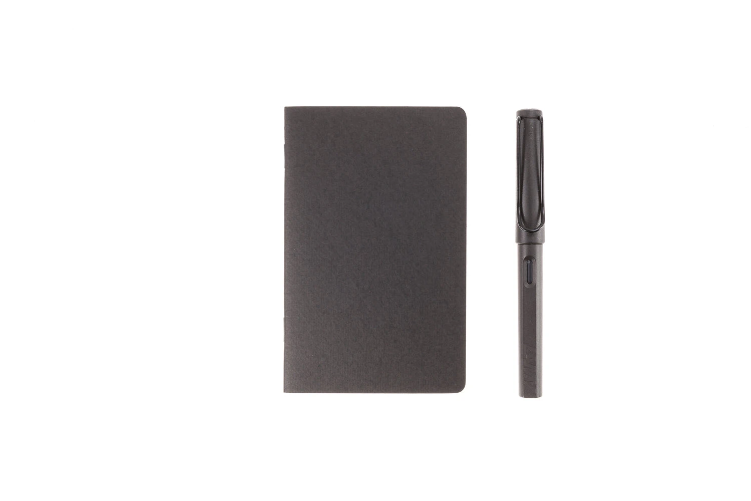 A Goulet Pens exclusive! This side stapled notebook features 32 sheets (64 pages) of white 68gsm fountain pen friendly 7mm lined Tomoe River paper, a graphite black 150g kraft paper cover printed with soy ink, rounded corners, and measures 9cm x 14cm (approximately 3.5in x 5.5in, similar to Field Notes size).