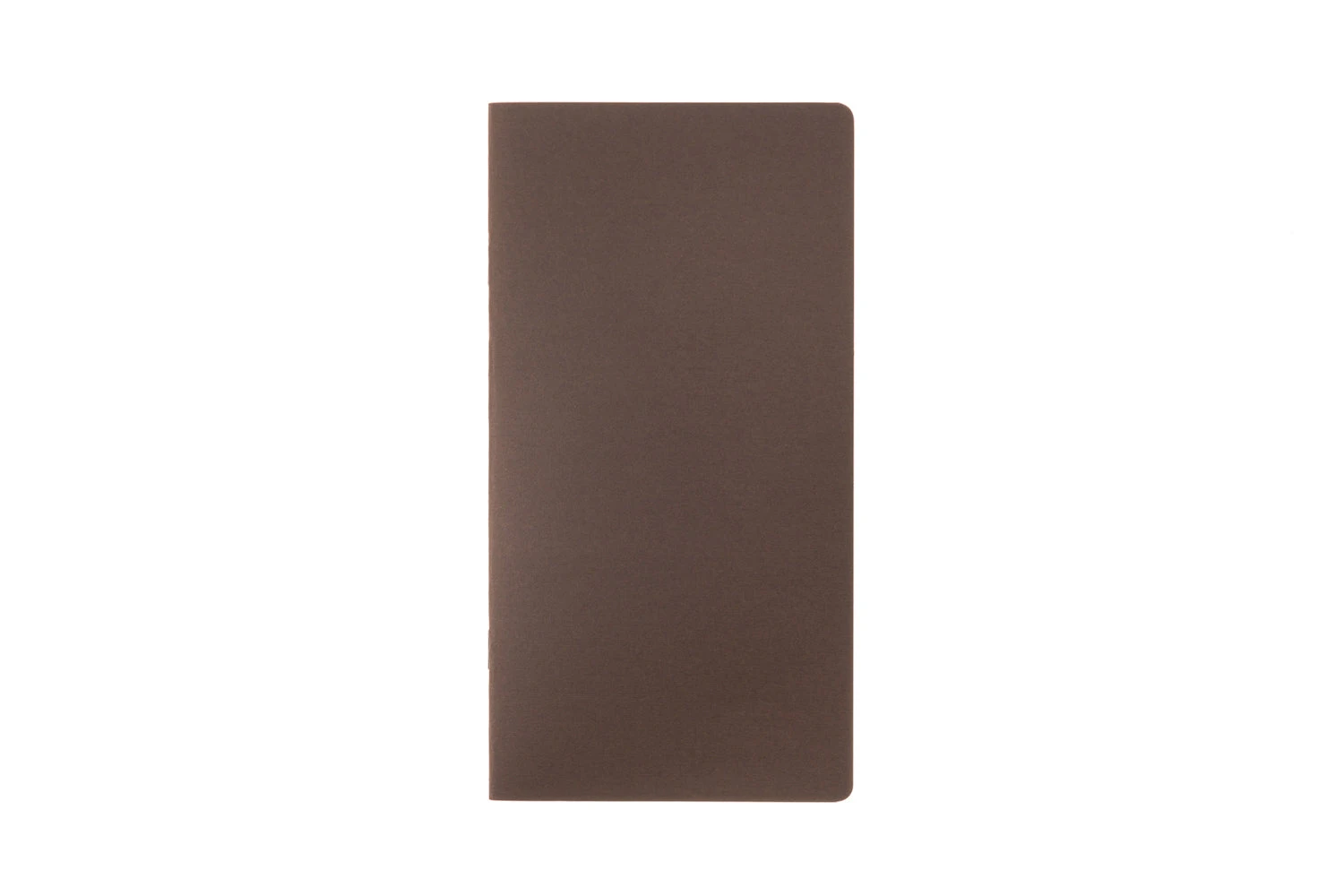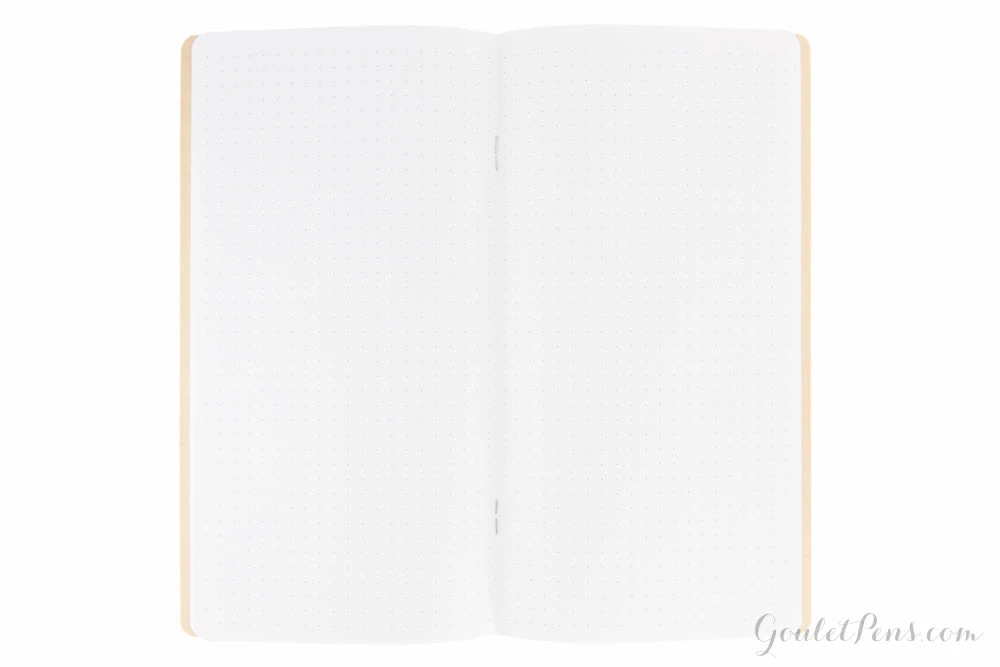 A Goulet Pens exclusive! This side stapled notebook features 32 sheets (64 pages) of white 68gsm fountain pen friendly dot grid Tomoe River paper, a dark brown 150g kraft paper cover printed with soy ink, rounded corners, and measures 11cm x 21cm (approximately 4.33in x 8.25in). Use it as a refill for inside your regular sized Traveler’s Notebook or as a standalone notebook. Great for bullet journaling!