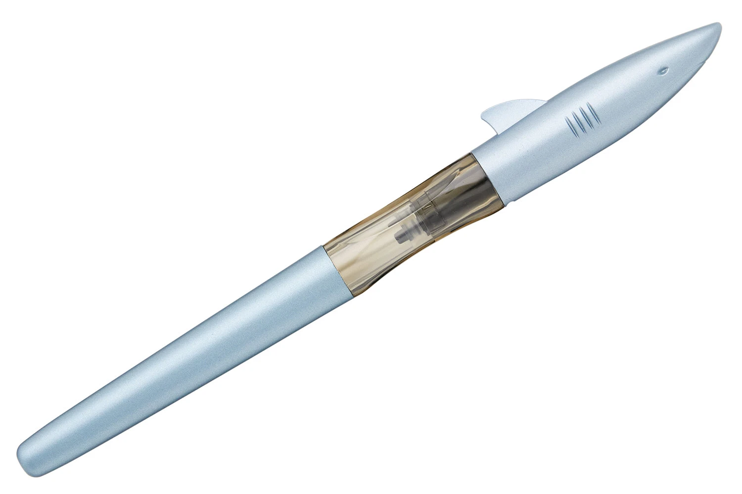 Attack your writing with a Jinhao Shark fountain pen! This fun plastic pen is a good writer for the beginner or the long-time enthusiast, and the hooded extra-fine steel nib provides a nice crisp line. It fills via standard international cartridge/converter (converter included, no ink) or can be converted to be eyedropper-filled. The shark head cap unscrews open and pushes to post. The translucent triangular grip assists in proper pen position. Perfect for kids, the avid shark enthusiast, or anyone who enjoys a fun affordable pen.