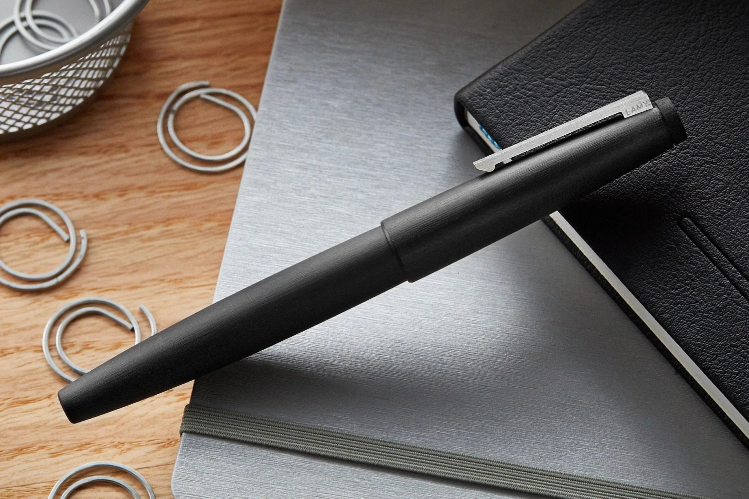 This LAMY 2000 rollerball pen is made of matte black polycarbonate with brushed stainless steel accents.Â
