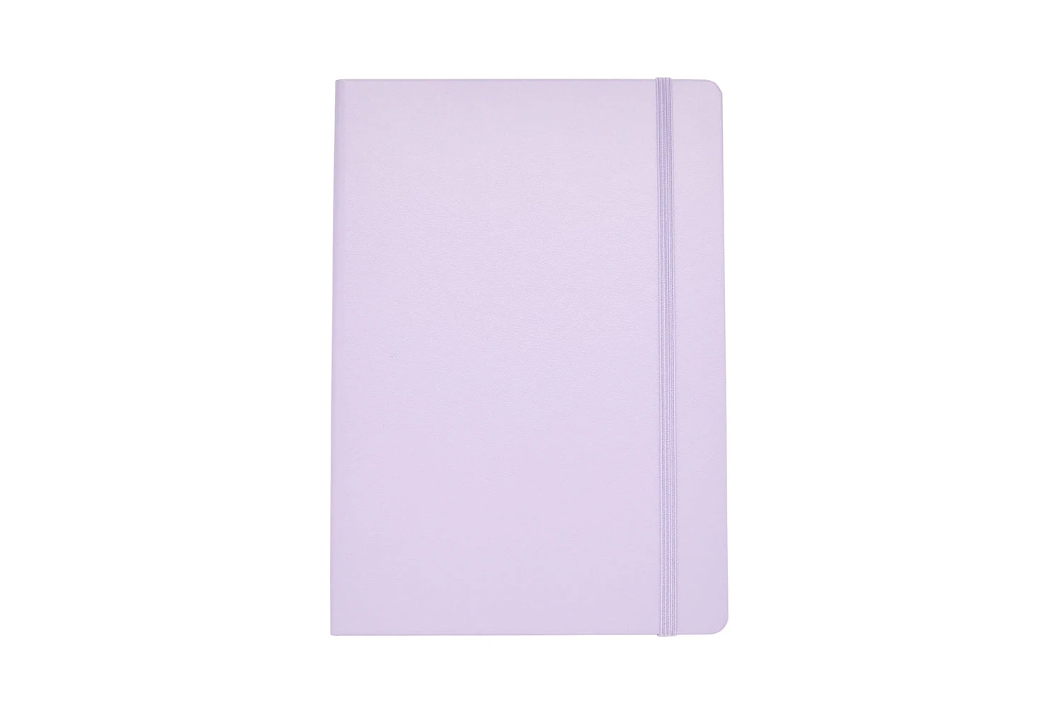 This pastel lilac medium A5 notebook is equally suited for the desk and for use on the move. It opens flat, and stays closed with an elastic band. Contains 144 pages of 80g ivory paper, and runs from January 2024 through December 2024.