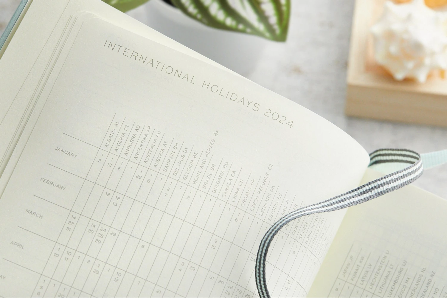 Other features include a 3-year overview, phases of the moon, official holidays in 58 countries, a project planner, a detachable sheet for notes, a gusseted pocket in the back cover, 2 ribbon bookmarks, a set of stickers for labeling the cover and spine for archiving, and an extra booklet with a birthday calendar and address book.
