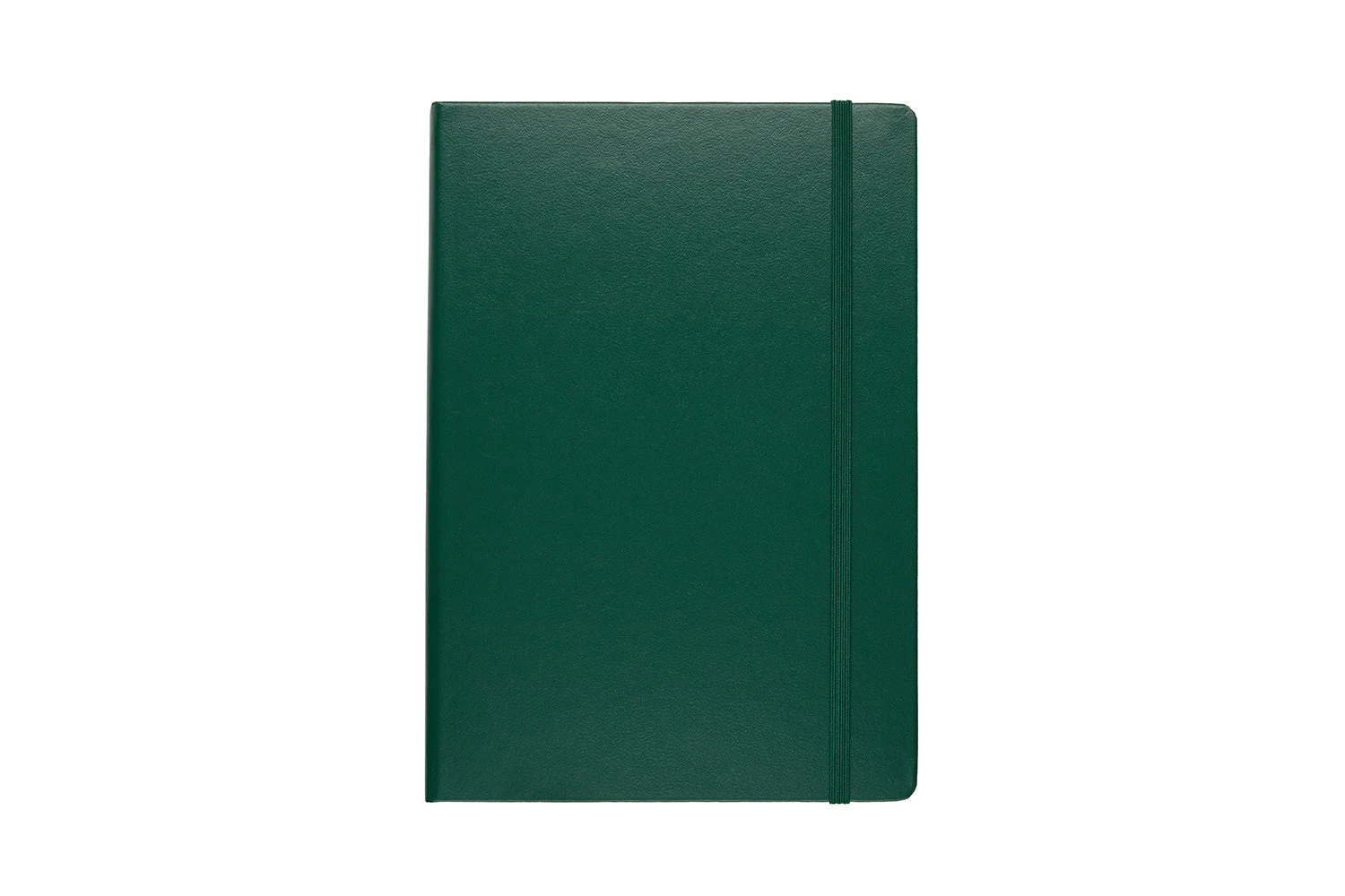 This medium A5-sized dark green Leuchtturm1917 hardcover notebook is equally suited for the desk and for use on the move. It contains 249 numbered pages (125 sheets) of 5mm dot grid 80g ivory paper. Features include an expandable pocket, a blank table of contents, two ribbon page markers, elastic band fastener, stickers for labeling/archiving, and it opens flat.