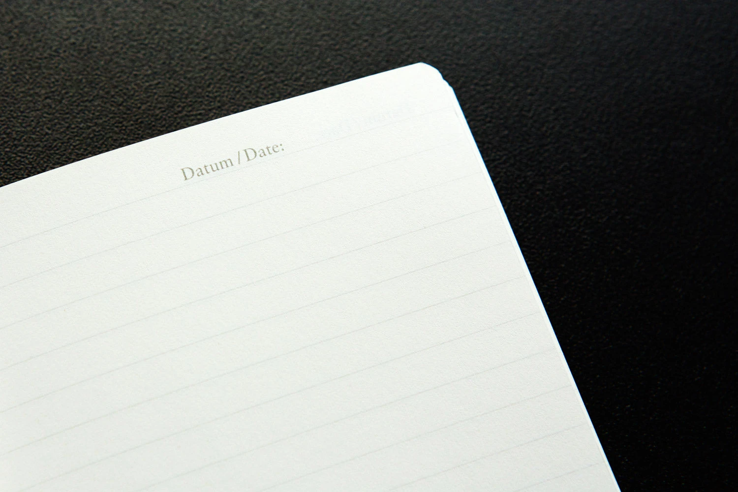 This medium A5-sized navy blue Leuchtturm1917 hardcover notebook is equally suited for the desk and for use on the move. It contains 249 numbered pages (125 sheets) of lined 80g ivory paper. Lines are spaced 6mm apart. Features include an expandable pocket, a blank table of contents, two ribbon page markers, elastic band fastener, stickers for labeling/archiving, and it opens flat.