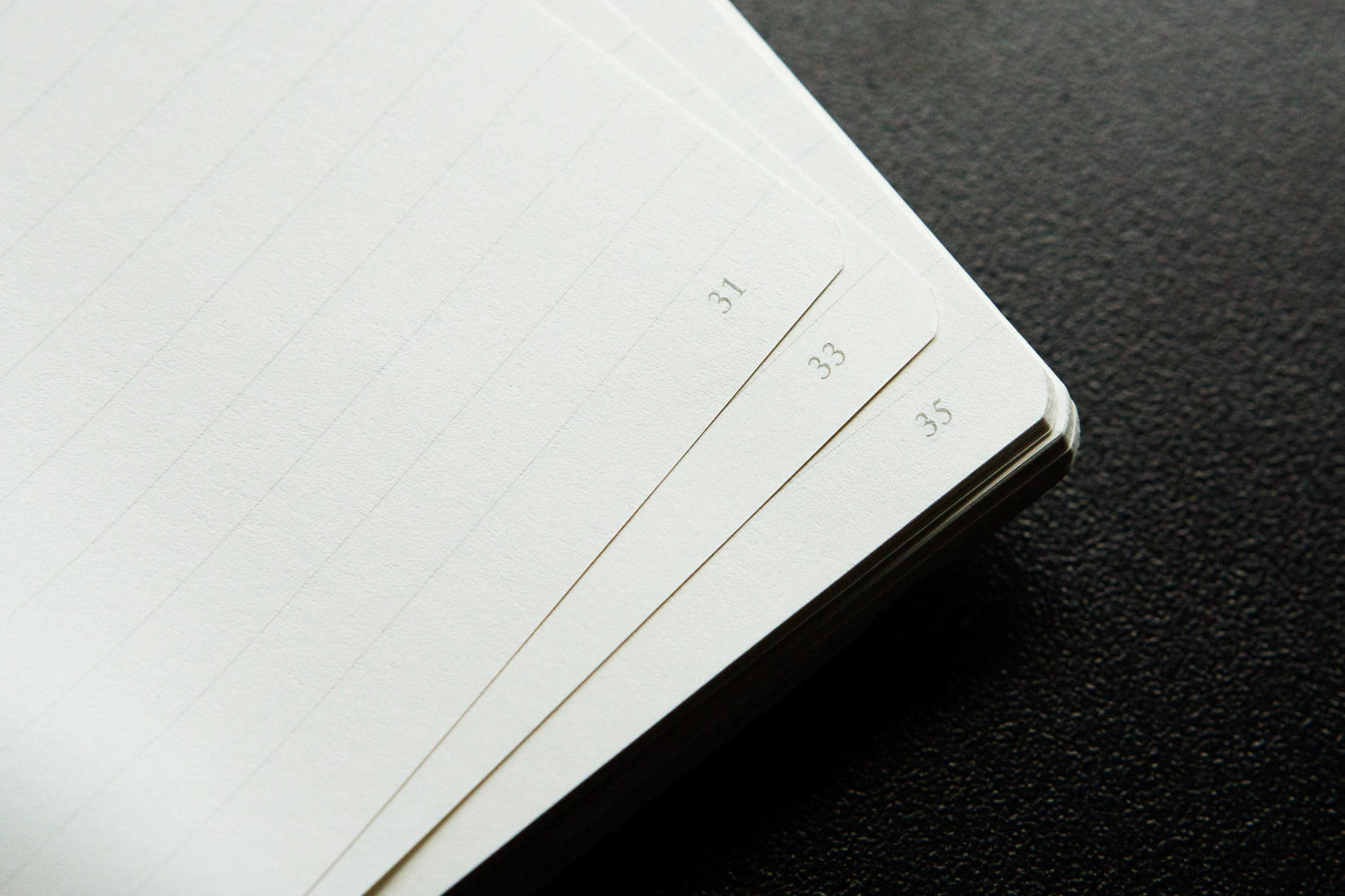 This medium A5-sized teal green Leuchtturm1917 hardcover notebook is equally suited for the desk and for use on the move. It contains 249 numbered pages (125 sheets) of lined 80g ivory paper. Lines are spaced 6mm apart. Features include an expandable pocket, a blank table of contents, two ribbon page markers, elastic band fastener, stickers for labeling/archiving, and it opens flat.
