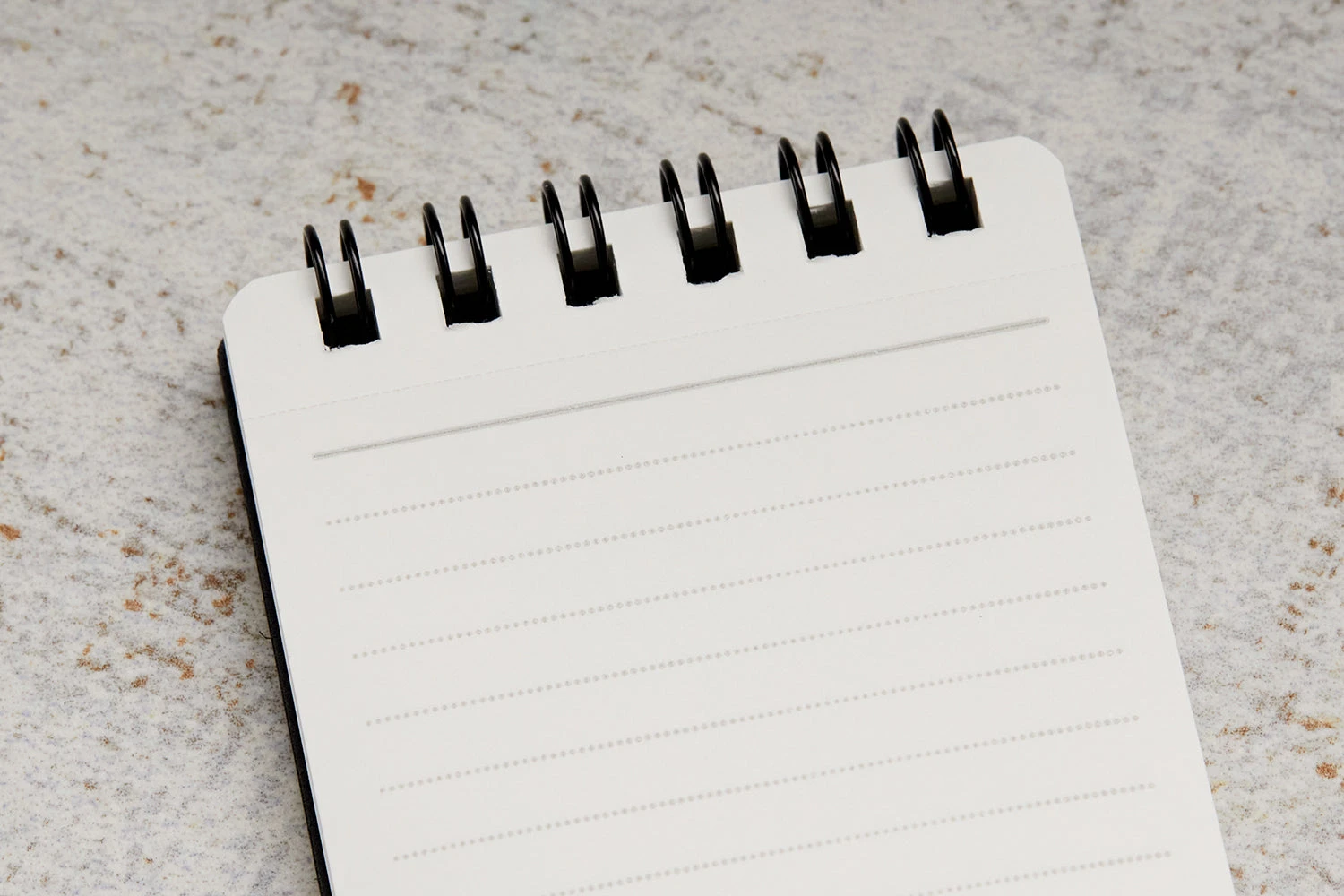 Made in Japan, this tiny notepad features 50 sheets of white acid-free 68gsm lined paper. The black double wire top spiral binding matches the black plastic cover. The notebook features 5mm line spacing with 18 rows per sheet (with a bold line every 9 rows), and every page is micro-perforated.