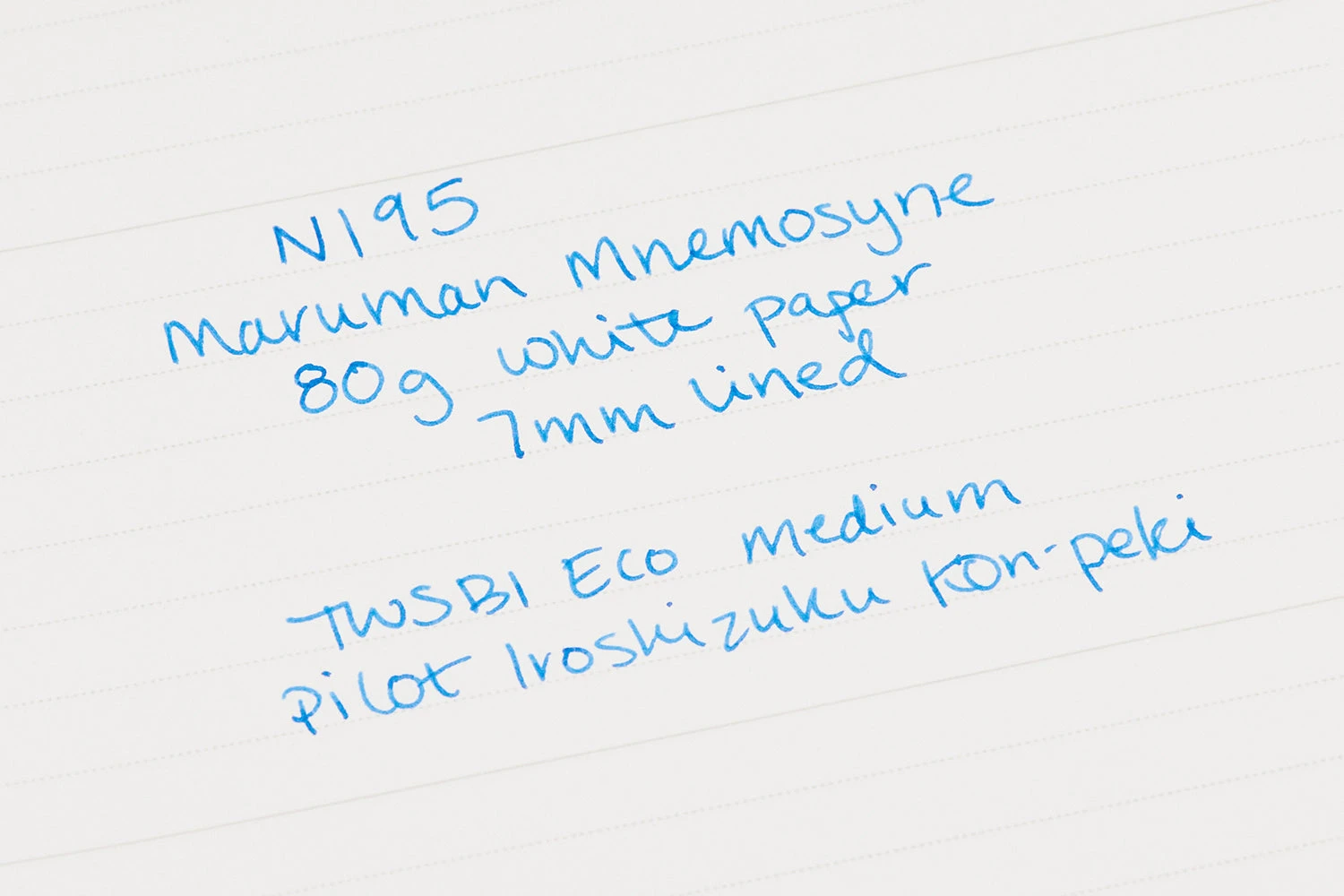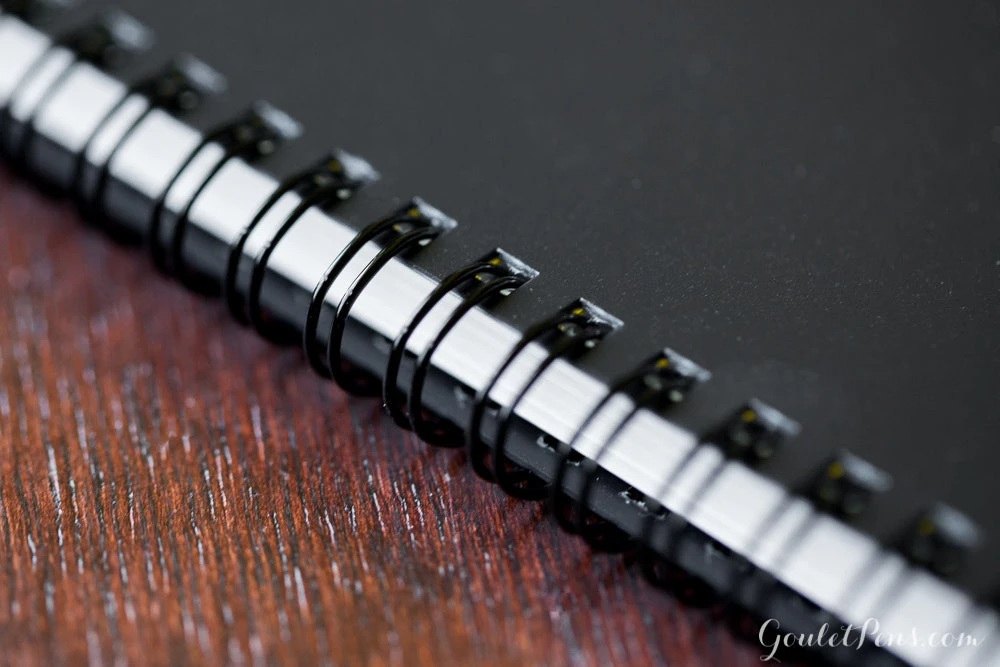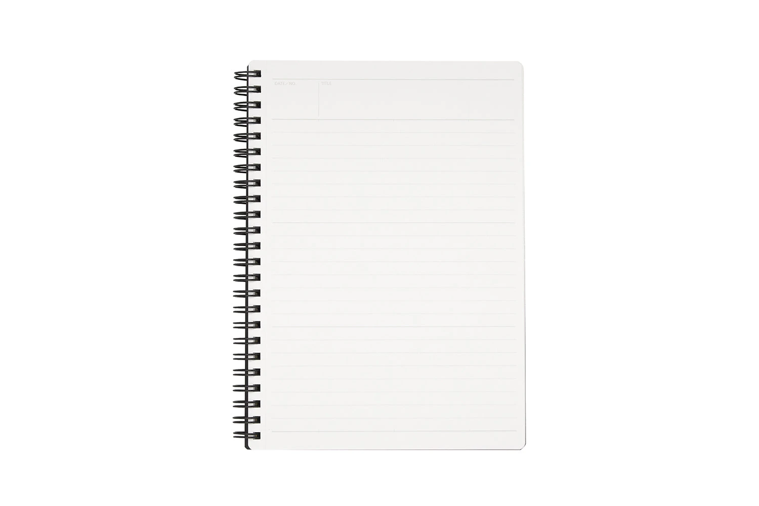 Made in Japan, this A5-sized notebook features 80 sheets of white acid-free 80gsm lined paper. The black double wire side spiral binding matches the black plastic cover. The notebook features 7mm line spacing with 24 rows per sheet (with a bold line every 8 rows), and every page is micro-perforated. Each sheet contains a blank margin at the top with a space for the date and title.