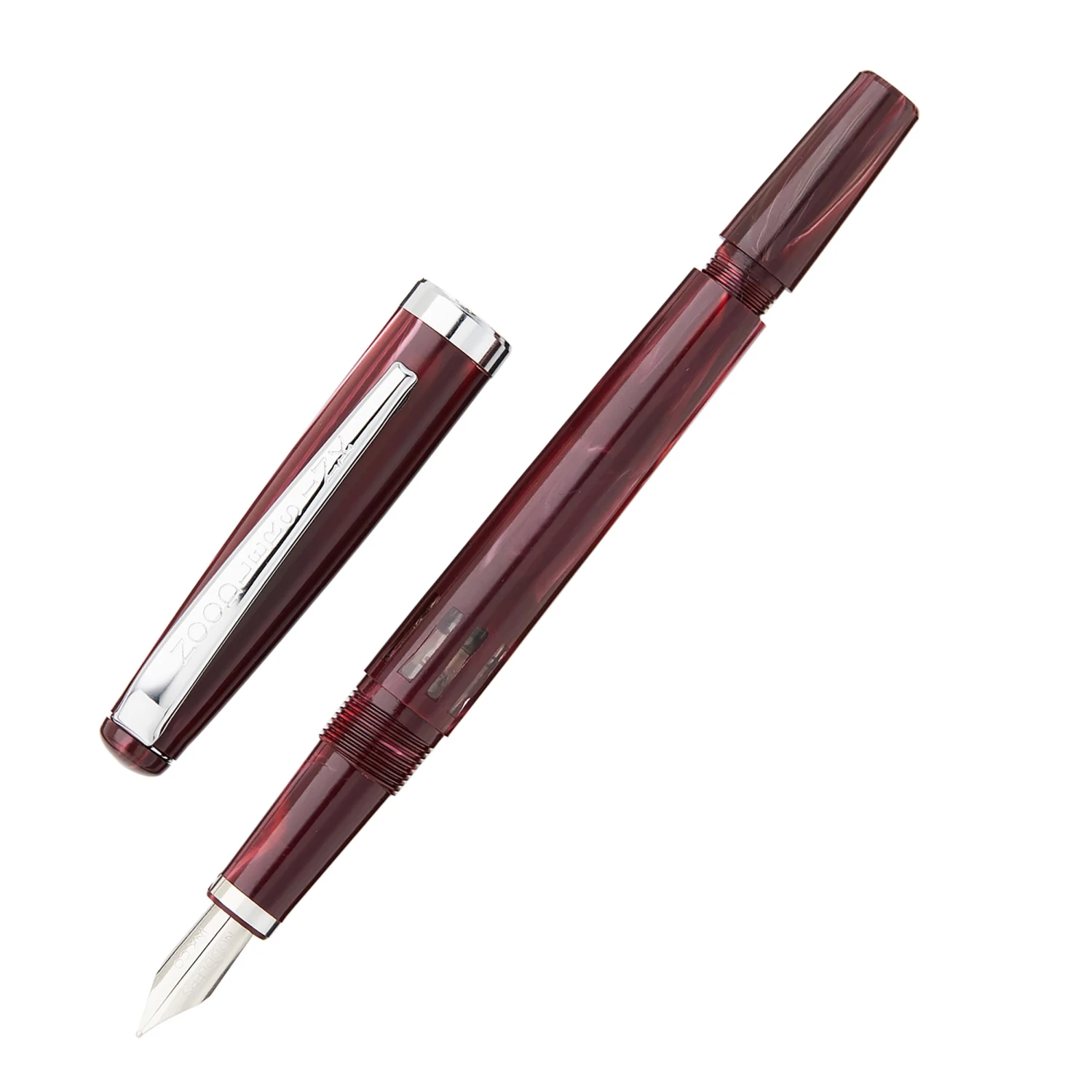 This burgundy and white Noodler’s Nib Creaper flex fountain pen features a small, slender body with a steel flexible #2 nib and a twist piston mechanism. A small ink window shows how much ink is left in your pen. These pens are made from a celluloid derivative. The vegetal resin body of this pen may show particles or striations within the material. This is most noticeable in demonstrators and bright colors.
