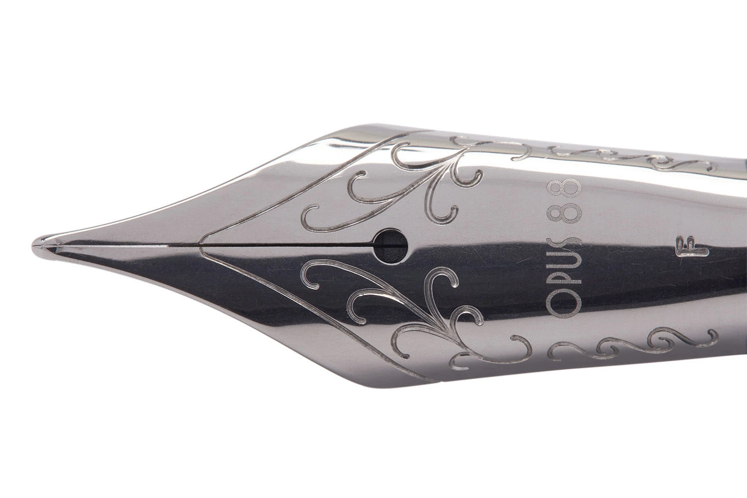 The Opus 88 Demonstrator fountain pen is a truly unique writing instrument. This large non-postable pen is an eyedropper-filled pen with a piston operated shut-off valve. Featuring a sharp alternating material scheme of frosted and clear resin, this pen’s design stands on its own. It has a sleek black clip and a silver stainless steel #6 JoWo nib and includes a glass eyedropper to fill the pen with your favorite ink.
