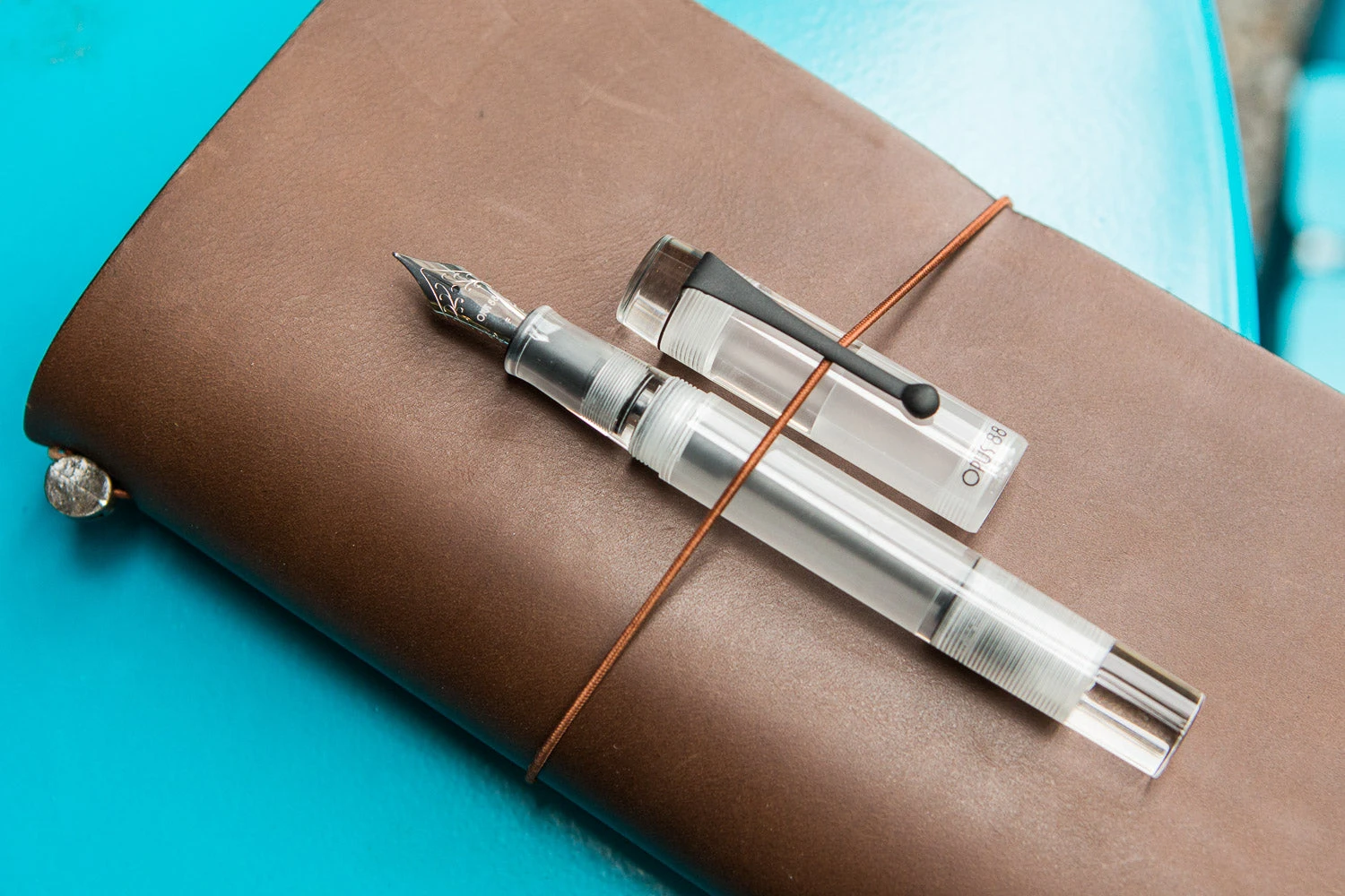 An ebonite piston and rubber gasket seals the feed off from the barrel when fully depressed, reducing the risk of leakage and burping. By unscrewing the blind cap and loosening the rod at the rear of the barrel, you open up the ink flow to the feed. During long writing sessions, leave the shut-off valve open to take advantage of the impressive ink capacity. Having a completely clear pen body allows you to see both your current ink level and your nib while capped.
