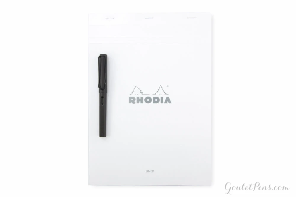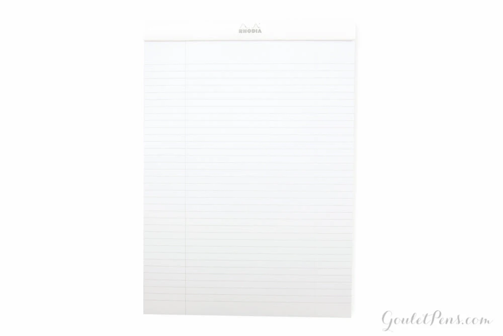 This A4-sized white Rhodia notepad features 80 sheets of extra white 80g acid-free, pH neutral ruled paper.Lines are spaced 7mm apart, and there is a subtle vertical margin line on the left. Each sheet is microperforated at the top for easy and clean removal. The top stapled cover folds back cleanly, and there is a hard cardboard back for writing support. These economical pads are a favorite of artists, designers, writers, and notebook fans for notes, sketching, and hand drafting. People love them for their smooth paper and iconic cover.