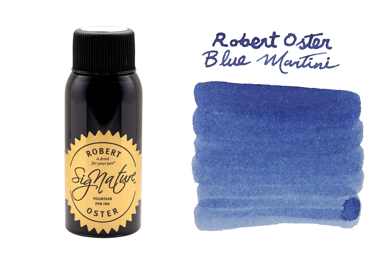 50ml plastic bottle of Robert Oster fountain pen ink in a blue color called Blue Martini. This shades pale-to-rich blue hues.Â
