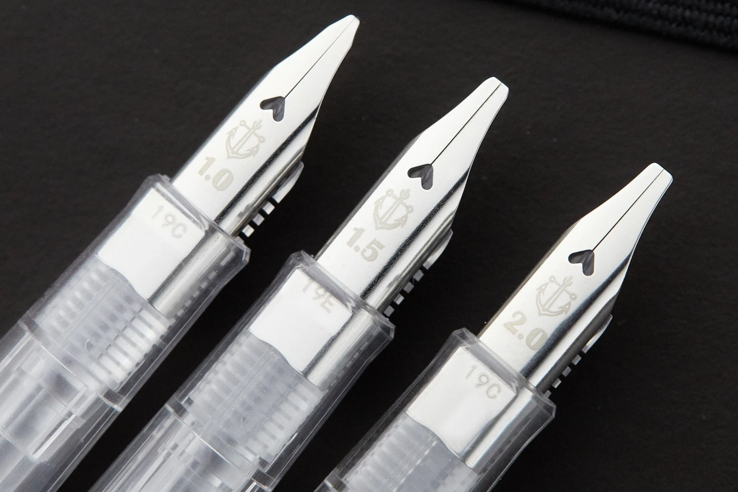 This Sailor Compass HighAce Neo calligraphy fountain pen has a transparent clear resin body, a blue cap, a clear feed, and silver trim. It comes with a stainless steel nib available in three stub italic nib sizes. Each pen comes with three proprietary Sailor Black ink cartridges; you can also purchase a Sailor converter separately to use bottled ink.