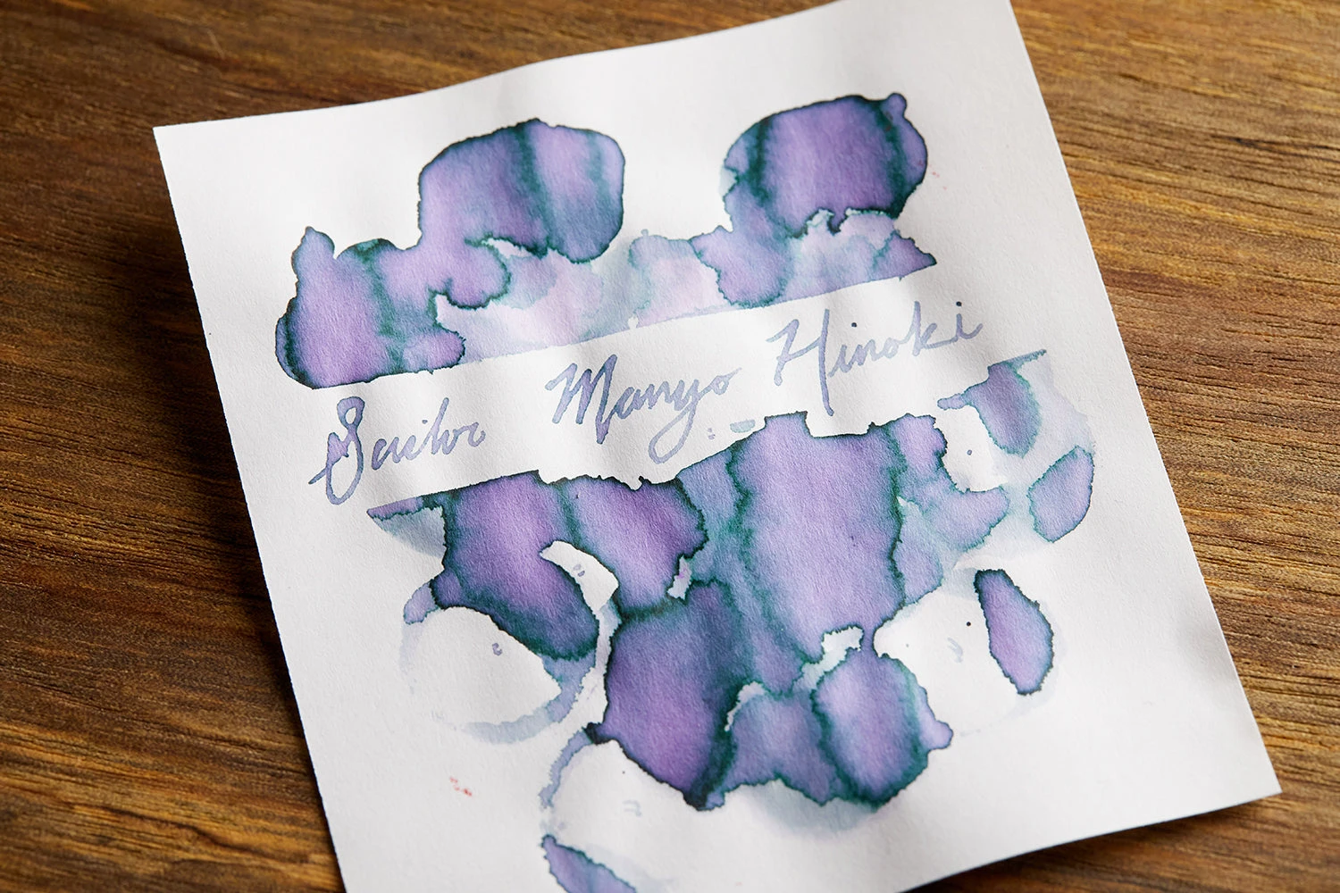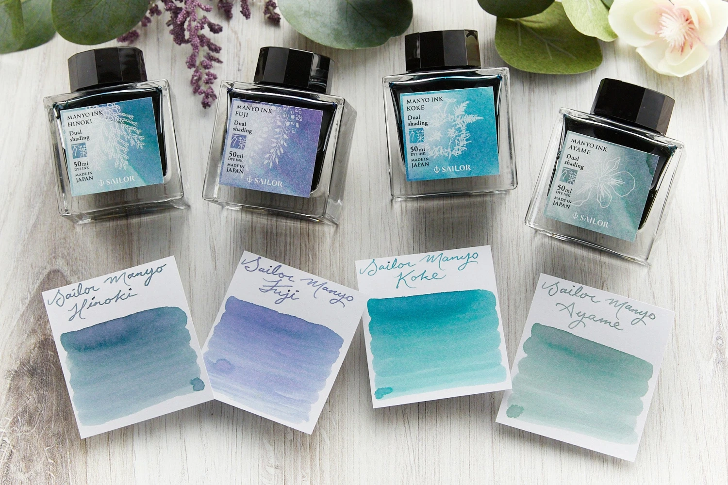 50ml square glass bottle of Sailor Manyo Hinoki dual shading fountain pen ink. This smooth-flowing water-based dye ink is specifically formulated to be safe for all fountain pens.