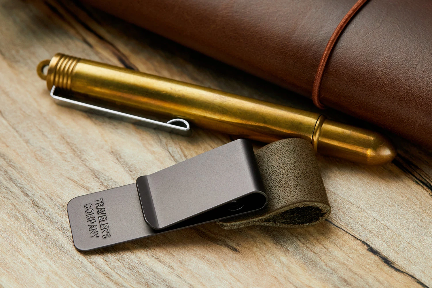 Attach this to the leather cover of the Traveler’s Notebook to hold a pen. It can hold pens of diameter up to 12mm. Metal clip, olive leather pen holder.