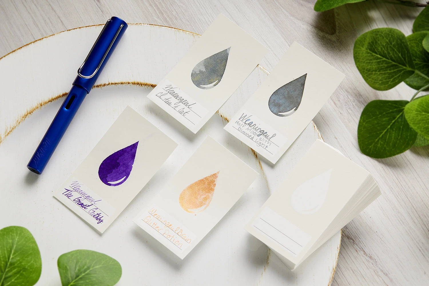 Beneath the ink drop, there is space to write the brand name, ink name, or your choice of text. The paper is Wearingeul’s Impressions paper with a weight of 200g/m².